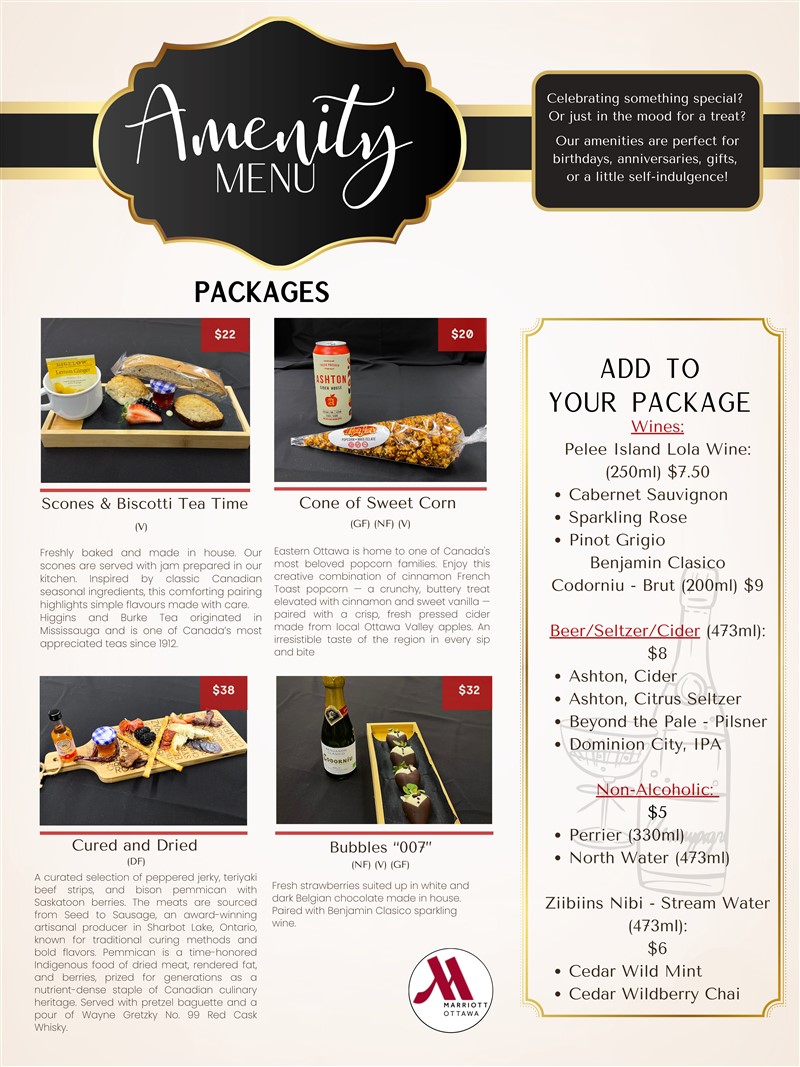 Start your stay right by adding one of our beautifully crafted amenity packages to your Ottawa Marriott room.